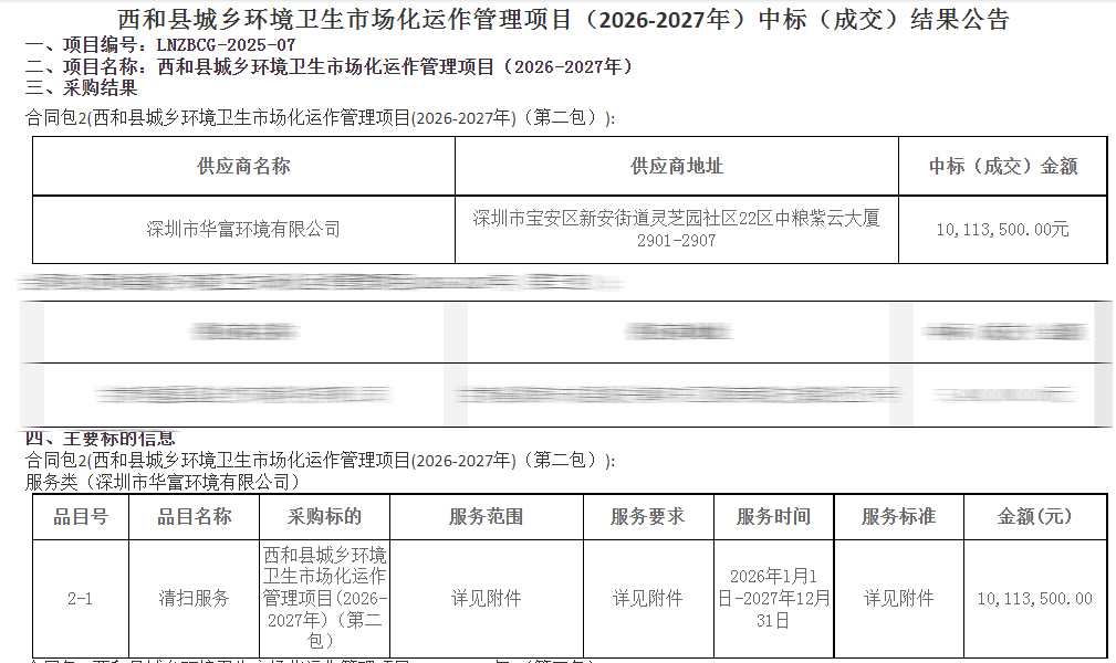 继前两轮服务深耕后,深圳市华富环境有限公司成功中标“西和县城乡环境卫生市场化运作管理项目(2026-2027年)第二包”—— 这是我们第三次携手西和,开启新一轮环卫服务合作!