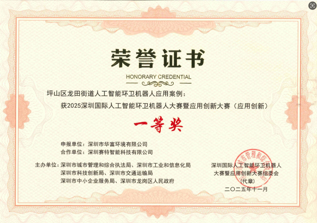 深圳市华富环境有限公司申报的“2025深圳国际人工智能环卫机器人大赛暨应用创新大赛”,成功斩获一等奖!
